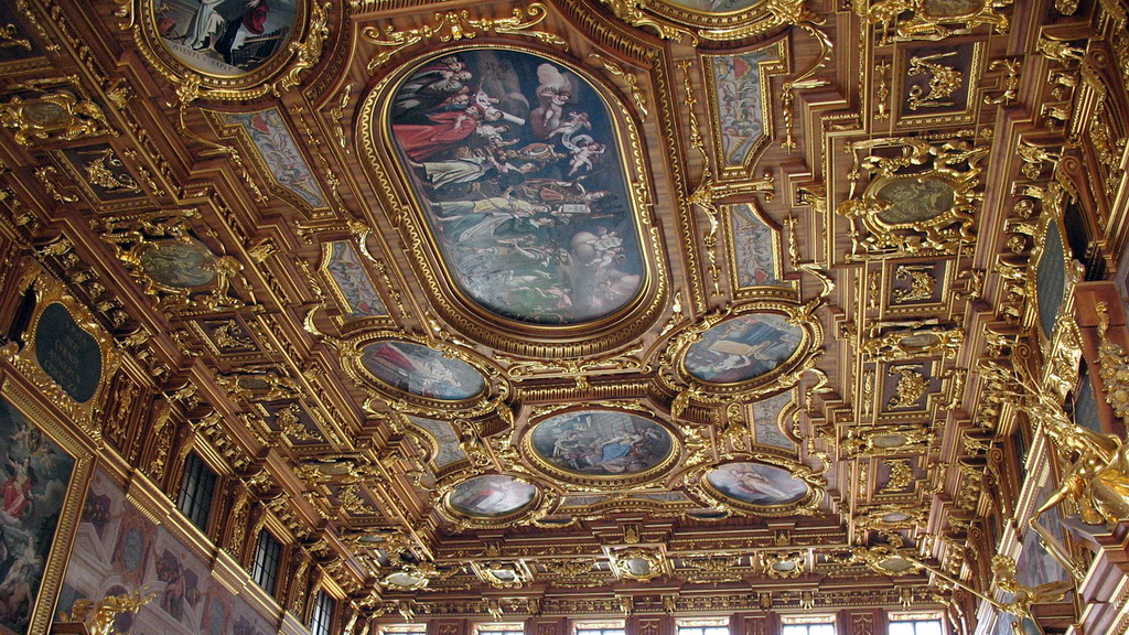 Augsburg – Rathaus* (1620), der bedeutendste Profanbau der deutschen Renaissance, errichtet von Elias HOLL, bei seiner Fertigstellung das weltweit einzige Gebäude mit mehr als sechs Etagen. Der Goldene Saal ist einer der imposantesten Repräsentationsräume Deutschlands. Der Perlachturm neben dem Rathaus mit einer Aussichtsplattform in 70 m Höhe ermöglicht einen Blick bis zu den Bergen. |